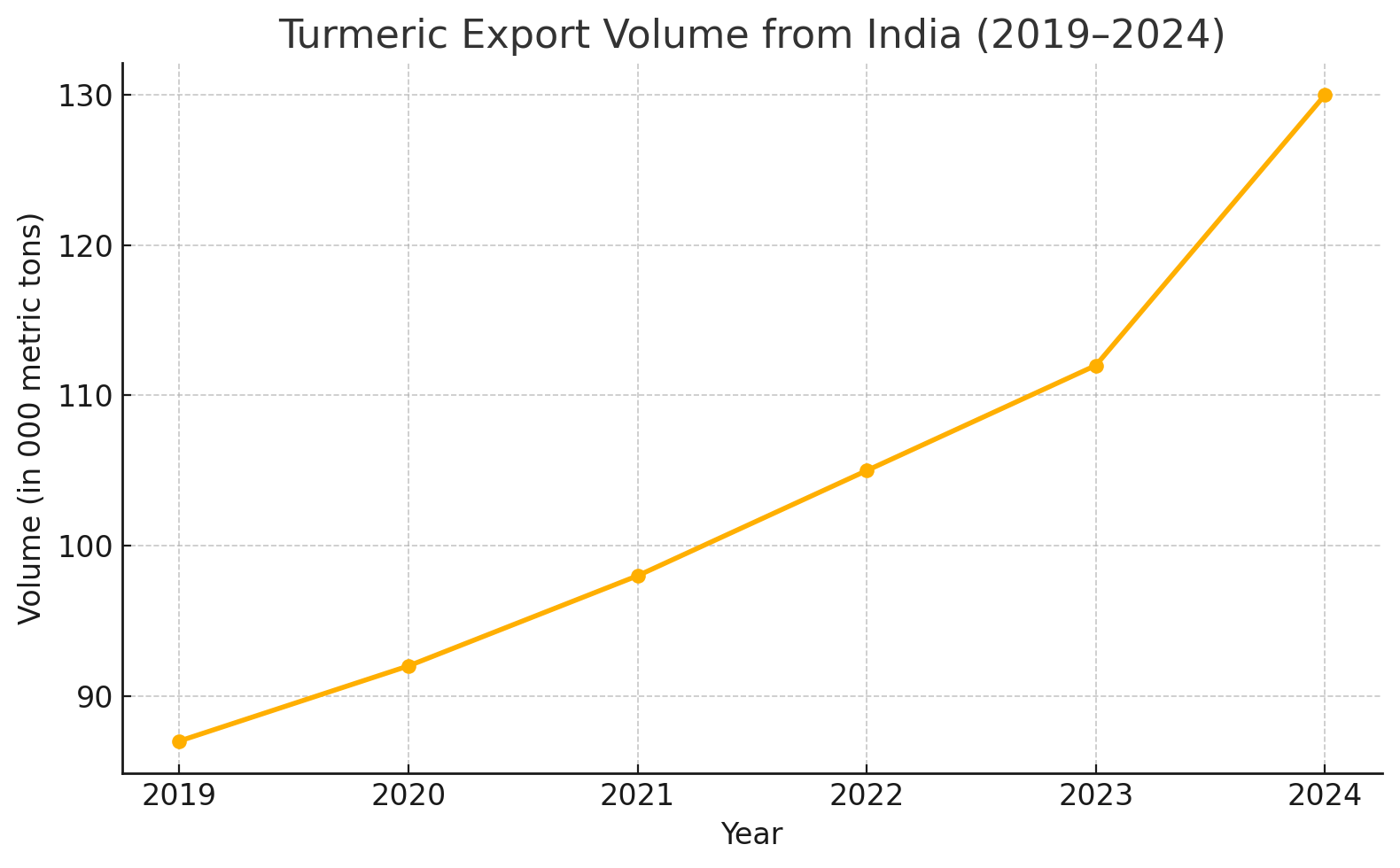 Turmeric exports from India have grown steadily over the years. In 2019, India exported around 87,000 metric tons, which increased to 130,000 metric tons by 2024.